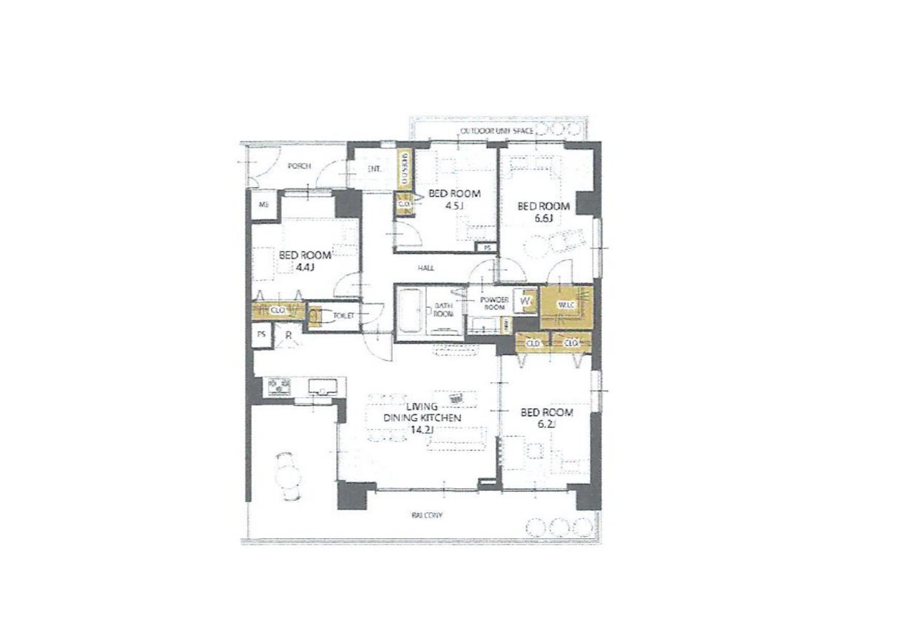 | 間取 | 4LDK (洋室4.4帖、洋室4.5帖、洋室6.6帖、洋室6.2帖、LDK14.2帖) | ||