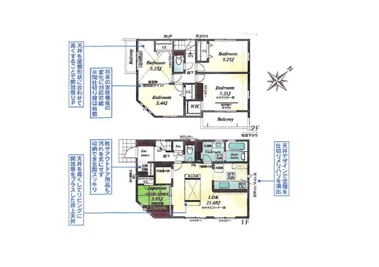 | 間取 | 4LDK (LDK21.68帖、和室3.95帖、洋室5.25帖、洋室5.44帖、洋室5.25帖、洋室7.44帖) | ||