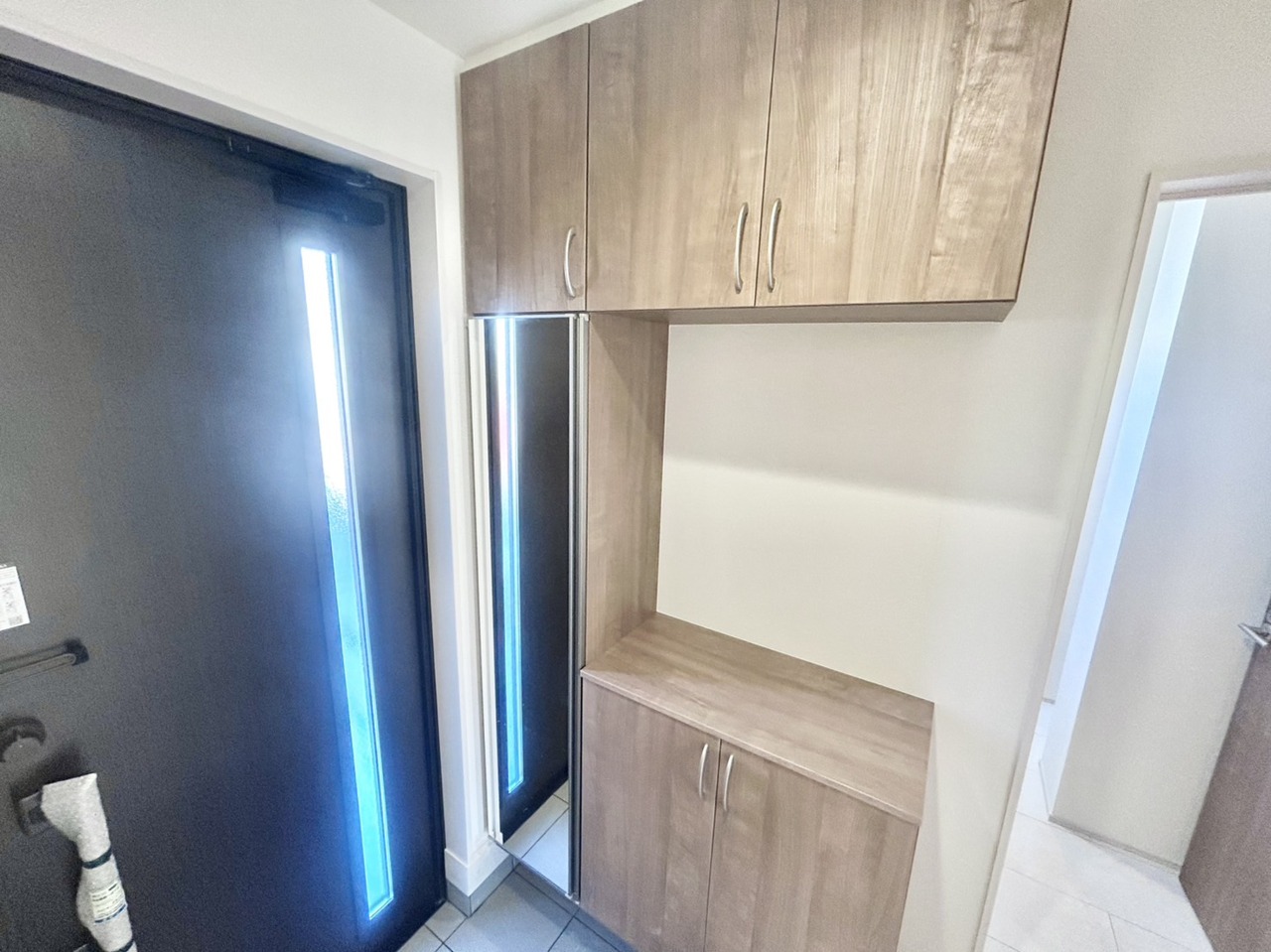 ドアスリットから差し込む陽射し 収納力のある明るい玄関