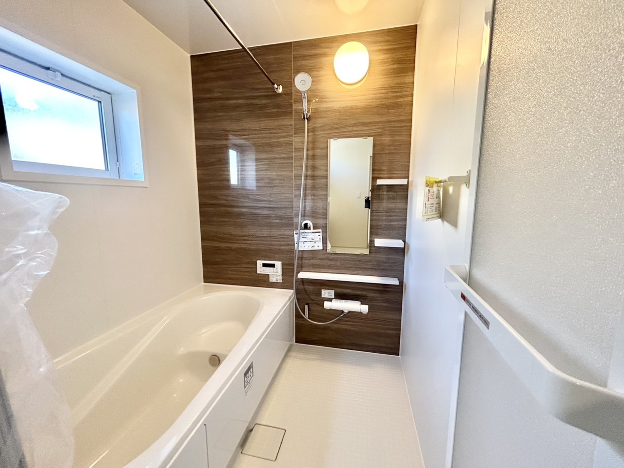 ゆったりと足の延ばせるバスタブとアクセント壁 お洒落なデザインの浴室で一日の疲れを癒して明日に備えましょう