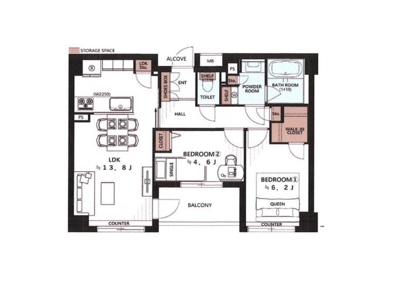 | 間取 | 2LDK (LDK13.8帖、洋室4.6帖、洋室6.2帖) | ||