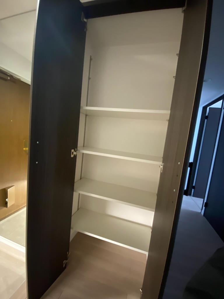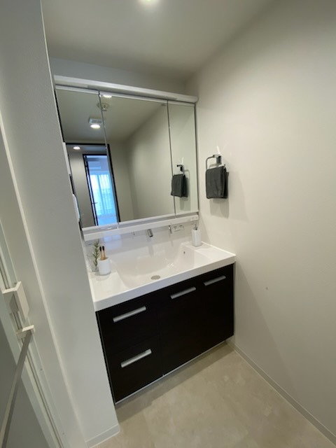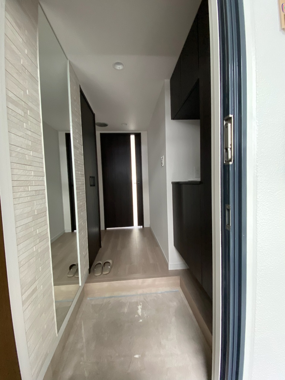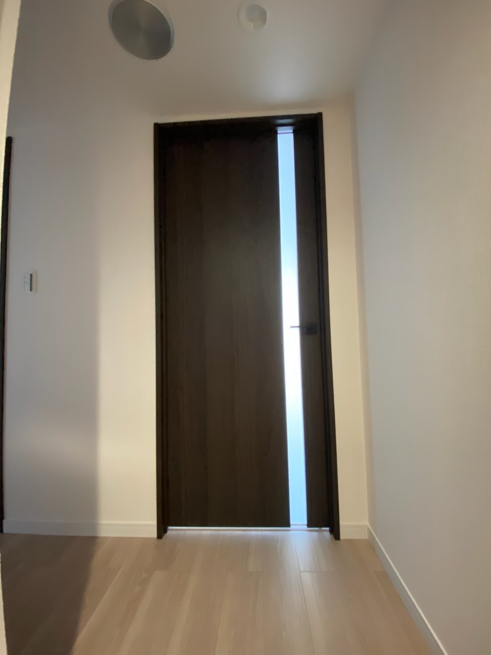 外出時に身支度を整えるのに便利な姿見。鏡に映る効果で空間の広がりを感じます。
