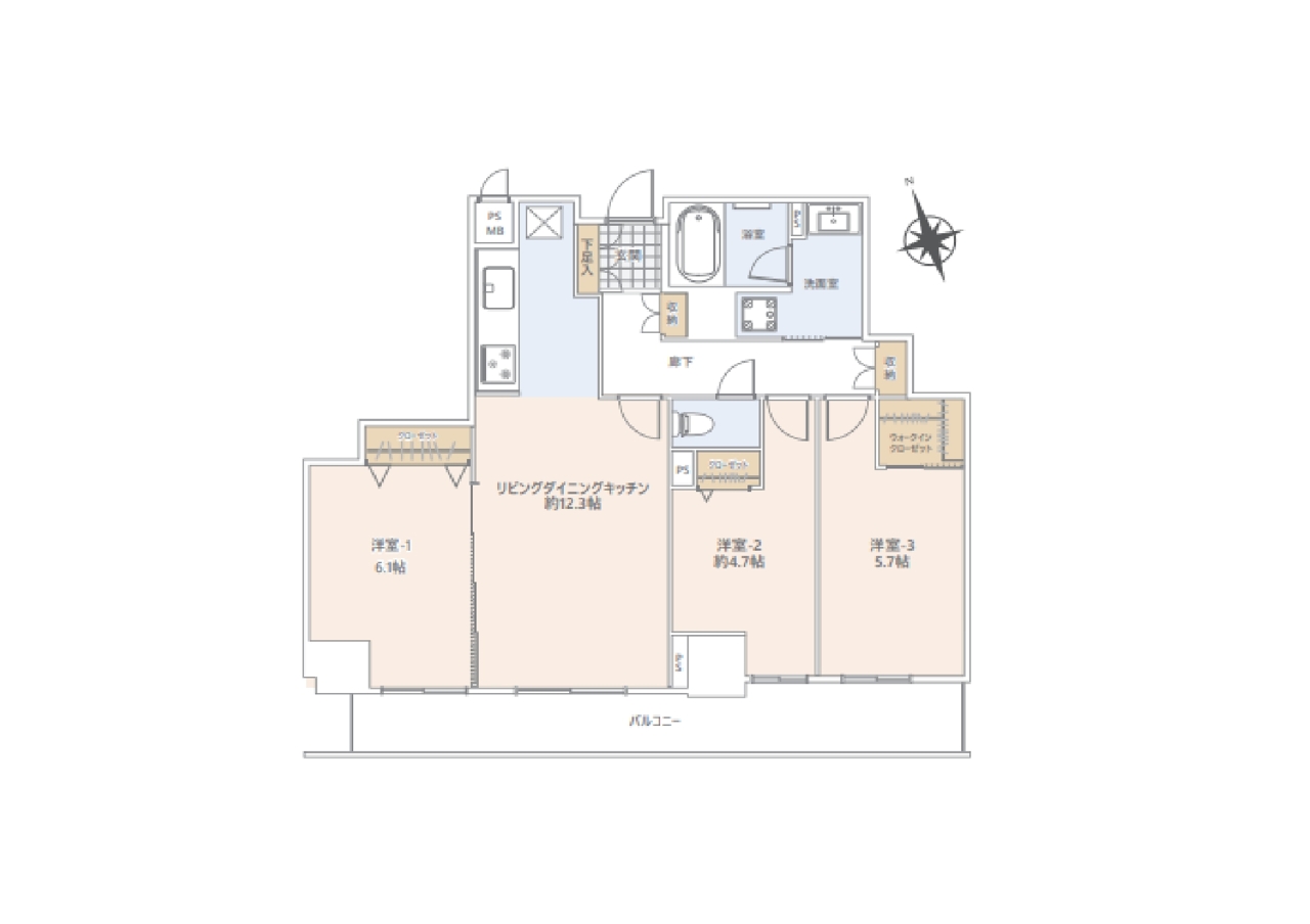 | 間取 | 3LDK (洋室6.1帖、LDK12.3帖、洋室4.7帖、洋室5.7帖) | ||