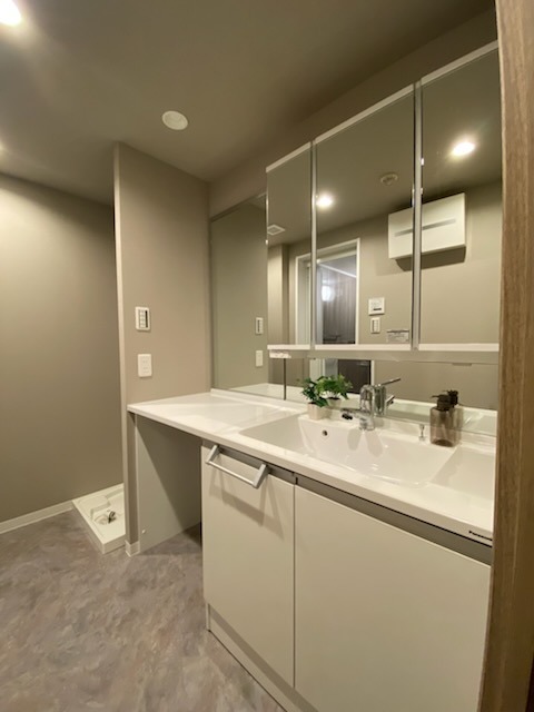 清潔感あふれる洗面空間は、鏡の奥に広がる収納でスッキリと片付き、毎日の身支度が心地よい時間になります