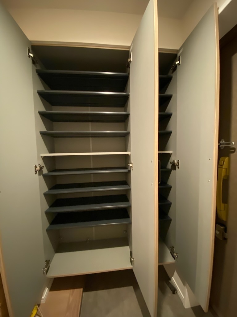 整然とならんだ沢山の棚で収納力たっぷりのシューズクローク